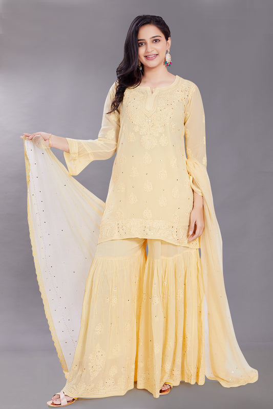 Shagufta Lemon Yellow Muslin A Line Kurti with Frills.